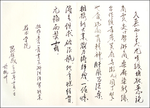 11月1日,全国供销合作总社常务理事、科技教育与工业部部长、全国供销合作职业技术教育学会会长张祥茂同志来我院视察。张部长听取了我院领导的工作汇报,视察了新校园,并了解了我院二期工程建设的进展情况,同时兴致勃勃地参观了我院在体育馆举行的 “让‘浙商精神’走进校园”的图片展。张部长对我院近年来取得的办学成绩予以了充分的肯定,并即兴题词为贺。贺词内容为:“久慕西子美,尤叹钱塘壮。平心论商贾,交口赞浙商。桑麻染新绿,合作绽奇芳。笑看弄潮儿,园丁梦也香。风雨育精神,肝胆写沧桑。相携创大业,鼎力铸辉煌。一任惊涛去,但求破浪航。他年忆往昔,无悔两鬓霜。”