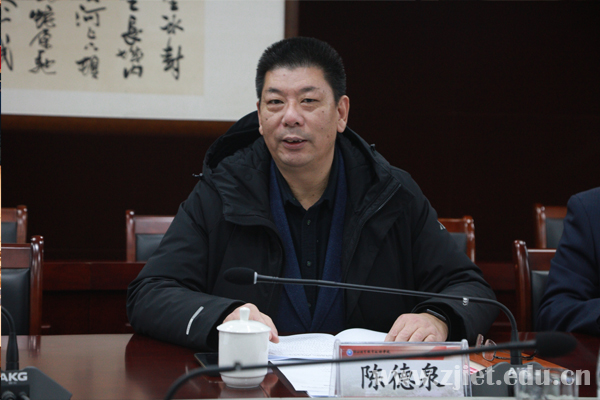 陈德泉介绍了学校的办学历史、办学特色、取得成就及发展瓶颈,并从持续改善办学条件、深化教学改革、推进立德树人、服务行业区域和打造经贸铁军等五方面交流了学校推动高水平职业大学建设的主要举措。他指出,当前我国高职教育全面进入了提质培优、增值赋能、以质图强的新发展时期,学校现有硬件条件与本科层次职业学校建设标准还存在一定的差距,希望区校之间联动进一步加强,集聚优势资源,积极探索共生发展模式,为学校发展创造有利条件,为钱塘区高质量发展注入动力、增添活力,推动双方事业迈上新的台阶。