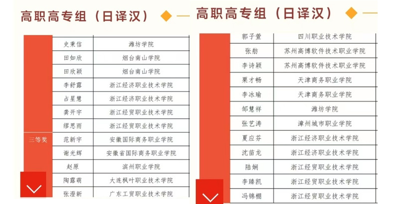 参赛团队在孙一敏、陈艳、许政三位老师的指导下,从5月开始利用暑假和课余时间,进行了培训和细致的指导,最终龚开宇、缪思雨同学获得了高职日译汉组二等奖,陆娴、李臻凯、冯锦棚同学获得了三等奖,冯娅欣等8名同学获得了优秀奖。