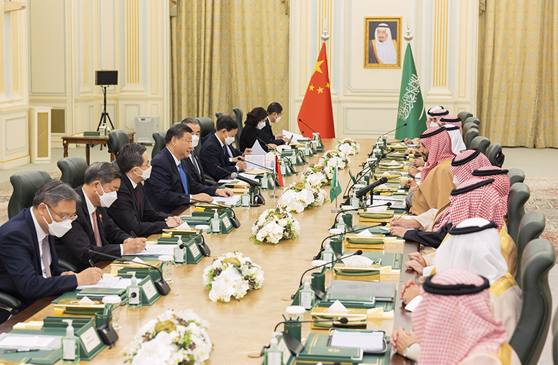 当地时间12月8日中午,国家主席习近平在利雅得王宫同沙特王储兼首相穆罕默德举行会谈。