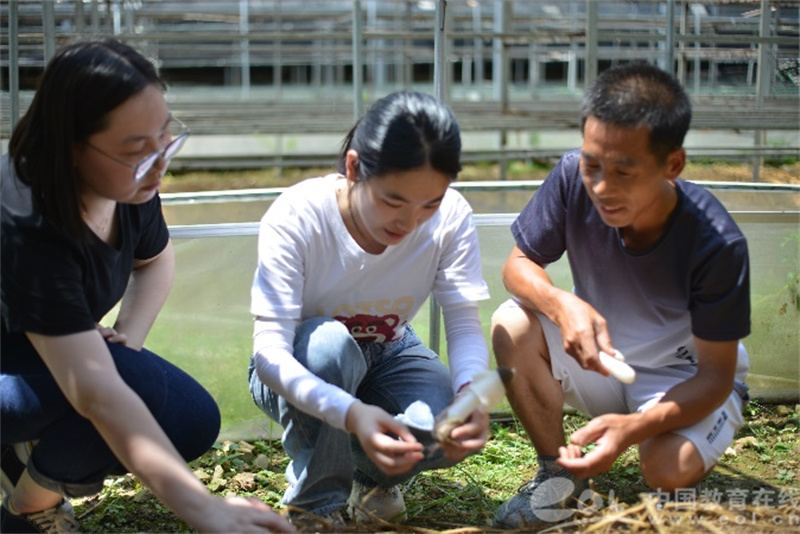 在球川镇东坑村,村支书、主任廖端泉介绍了村里近年来的发展变化,对团队前期与村里的兴意农场开展食用菌无土栽培基质的技术服务表示充分肯定和衷心感谢。兴意农场徐中明总经理带领实践小分队再次走进菌菇基地,近距离观察菌菇生长状况,这次已经是团队第二次验收食用菌无土栽培基质的试验结果了。在徐中明的指导下,团队成员亲自采摘菌菇,切身体验菌菇从泥土到餐桌的过程,团队创新提出的农业保水剂代替传统覆土栽培方式,在赤松茸、鸡枞菌等食用菌的基质栽培中得到验证,效果非常好,能有效提高食用菌菌棒的保水性能,可以有效增加菌棒持水能力以及增加喷水时吸水效果,减少水资源浪费,减少人工投入。