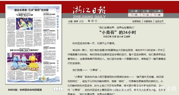 “小青荷”取自宋代诗人杨万里描写杭州西湖的诗句——“接天莲叶无穷碧,映日荷花别样红”,诞生于G20杭州峰会期间,谐音“亲和”,代表着志愿者微笑的亲和力。从G20峰会到杭州亚运会,如今上岗3.76万名志愿者,绝大部分是在校大学生和00后。这一代“小青荷”,在杭州亚运会上看到亚洲大家庭的文化交流,感到无比自豪与兴奋。很多志愿者说:“我们在看世界,世界也在看我们”。