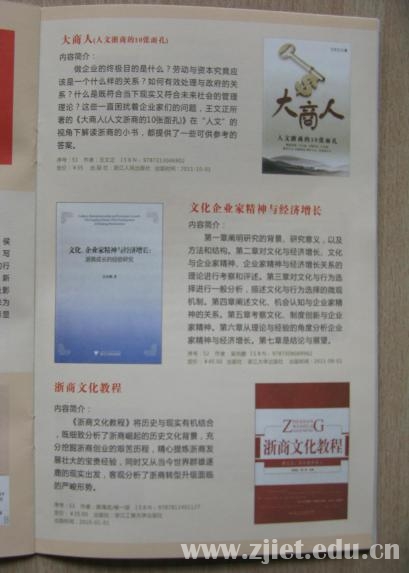 2008年,学校成立浙商文化研究所,组织人员开展浙商文化教育系列工作,在省内高校中率开设融入地方特色文化的通识课—《浙商文化》。多年来《浙商文化》课程以学校精品课程、在线开放课程、优质课、学校课程思政示范课、浙江省教育厅课堂教学改革项目、浙江省精品在线开放课程SPOC等形式每年惠及全校3000余名学生。2010年1月教材《浙商文化教程》顺利出版,并于2014年、2018年进行了两次修订,被列入浙江省党政干部推荐读物党的十七届六中全会专辑推荐书目。2023年新形态教材《浙商文化与大学生创新创业》顺利出版。2021、2022团队教师连续2年获得浙江省教师教学能力大赛三等奖。
