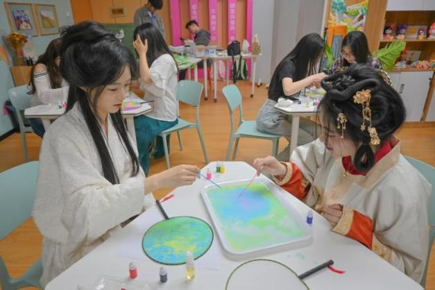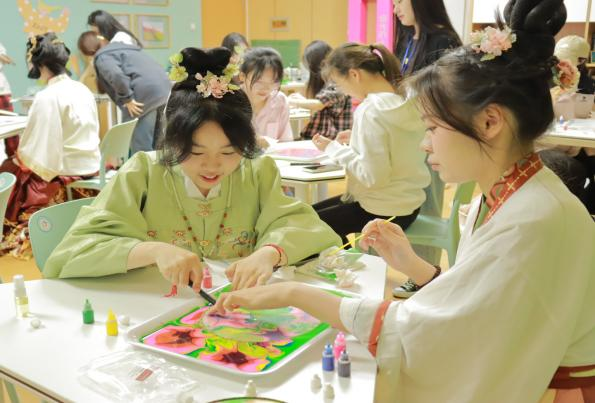 水拓画作为一项具有悠久历史的传统非遗艺术,水拓团扇活动一经推出,便吸引了众多学生的参与。活动还邀请了留学生参加,共同感受中国传统非遗文化魅力。在学校的智慧活动室,学生们身着广袖长裙汉服、头戴珠钗步摇,将调配好的颜料液倒入装水的画盆中,再滴入颜料慢慢扩散,借用工具设计出花纹或纹理,再将团扇平铺于画盆,待其晾干,一把传统美学与非遗艺术交织,色彩梦幻的水拓团扇便制作完成。水拓扇不仅极具审美价值,也有身心疗愈功能。