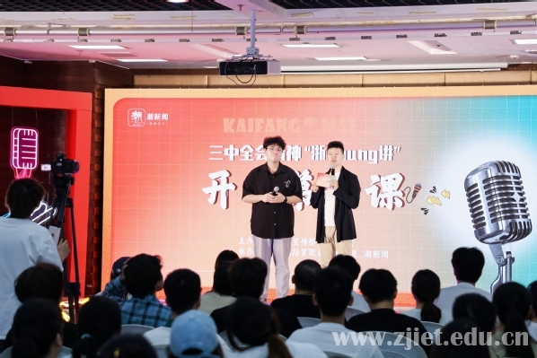 宣讲新秀王庆泽、姜歌以相声宣讲的形式,围绕《黑神话悟空》这一时下热点,将二十届三中全会精神《决定》中对于文化体制机制改革的精神融于宣讲内容,向同学们展现了中国优秀传统文化的魅力。00后talker郑德镇通过父母创业的故事,把浙商敢拼敢闯的精神展现出来。来自税务局的吴雨翰以挑选肉夹馍时“既要肥而不腻,又要瘦而不柴,还要来块最大的”的例子来比喻“改革需要把握多目标下的动态平衡”,进而阐述贯穿三中全会精神的方法论。