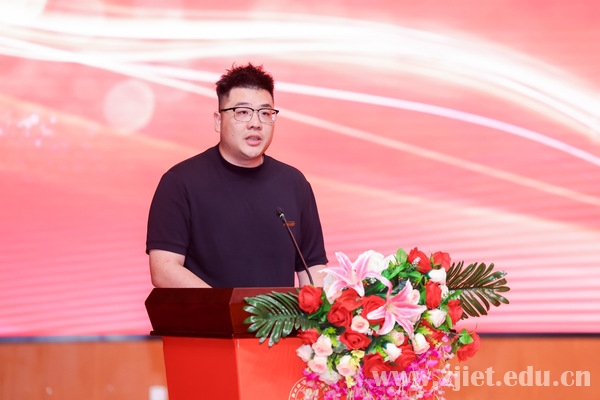 校友代表发言环节,学校建校的第一届校友代表——茶叶检验7801班俞快,分享了他与母校的故事,表达了对母校的深厚情感,特别是他对学弟学妹们的寄语“学到知识和本领,树立正确的三观,锤炼良好的品格,培养出色的能力”,饱含深情又充满真挚,全场雷鸣般的掌声经久不息。毕业生10年的校友代表——物流管理123班杨锦煊,成功创办了浙江台州锦天农业科技发展有限公司,他分享了自己的创业故事,寄语学弟学妹们“坚持学习,不负韶华;勇于创新,踔厉奋发;保持热爱,奔赴山海”,让我们感受到“厚德崇商”校训对经贸学子的引领与力量。
