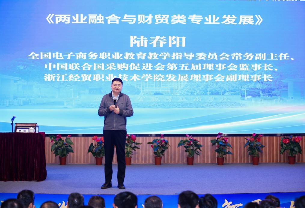 专家报告环节,陆春阳作题为《两业融合与财贸类专业发展》的主旨报告。他从两业融合的背景、意义、内涵、特征以及电子商务等财贸类相关专业如何转型发展的建构逻辑、路径方法、课程体系的重构等方面作了精彩阐述。整场报告高屋建瓴、深入浅出,富有理论性、思想性和指导性,对于学校下一步如何适应两业融合发展变化、优化调整专业设置、深化“五金”新基建建设等方面都具有很强的针对性、前瞻性和指导性。该环节由学校党委委员、副校长林锋主持。