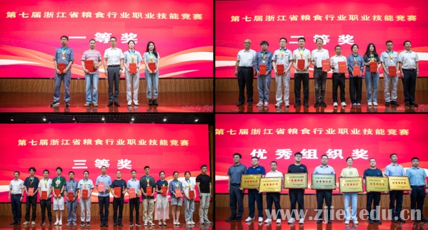 第七届浙江省粮食行业职业技能竞赛组委会主任、省粮食物资局党组书记、局长潘建漳,省财贸工会主席杨宝明、副主席宓嗣超,省部属企事业工会四级调研员张伟力,中储粮浙江分公司党委常委、总经理助理黄晓之,省农发集团有限公司党委委员、副总经理袁彤,学校党委书记劳赐铭,党委副书记许宝峰,党委委员、副校长林锋等出席颁奖仪式。