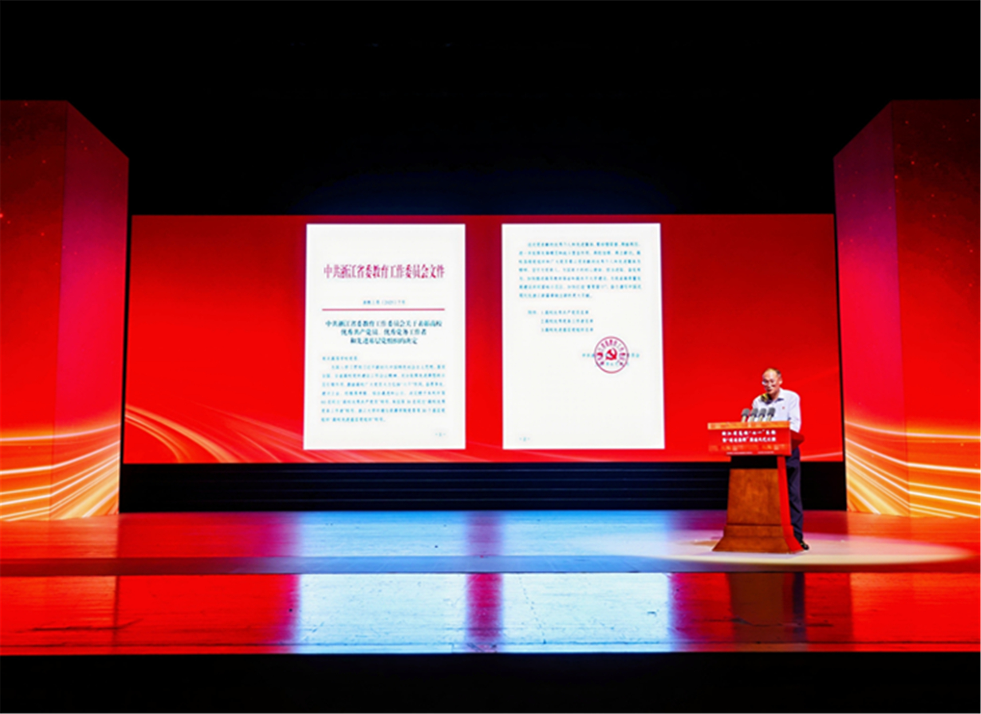 活动伊始,省委教育工委专职副书记、省教育厅党组副书记许翰信宣读“七一”表彰文件并为浙江省高校优秀共产党员代表颁发证书。省纪委常委、省监委委员王钢,省直机关工委副书记、纪检监察工委书记魏祖民分别为先进基层党组织代表、优秀党务工作者代表授予表彰证书。随后,浙江音乐学院党委书记干武东也受邀登台,四人一同为50年党龄老党员代表颁发“光荣在党50年”纪念章。