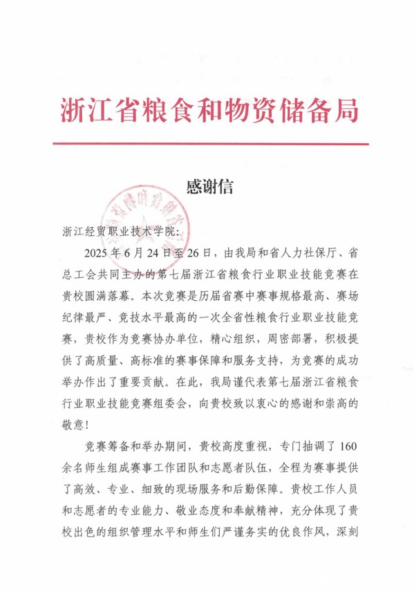 近日,学校收到浙江省粮食与物资储备局发来的感谢信,感谢学校在第七届浙江省粮食行业职业技能竞赛工作的支持。2025年6月24日至26日,由浙江省粮食与物资储备局和省人力社保厅、省总工会共同主办的第七届浙江省粮食行业职业技能竞赛在我校圆满落幕。本次竞赛是历届省赛中赛事规格最高、赛场纪律最严、竞技水平最高的一次全省性粮食行业职业技能竞赛。